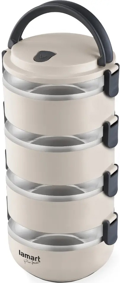 Jedlonosič – 4 poschodia, objem 2,4 l, materiál: plast, dvojitá vnútorná stena a silikónové tesnenie Praktická a spoľahlivá termoska na jedlo Temp LT6024 francúzskej značky Lamart by Piere Lamart ponúka vašej kuchyni moderného a cenovo dostupného pomocníka na uskladnenie a prenášanie horúcich aj