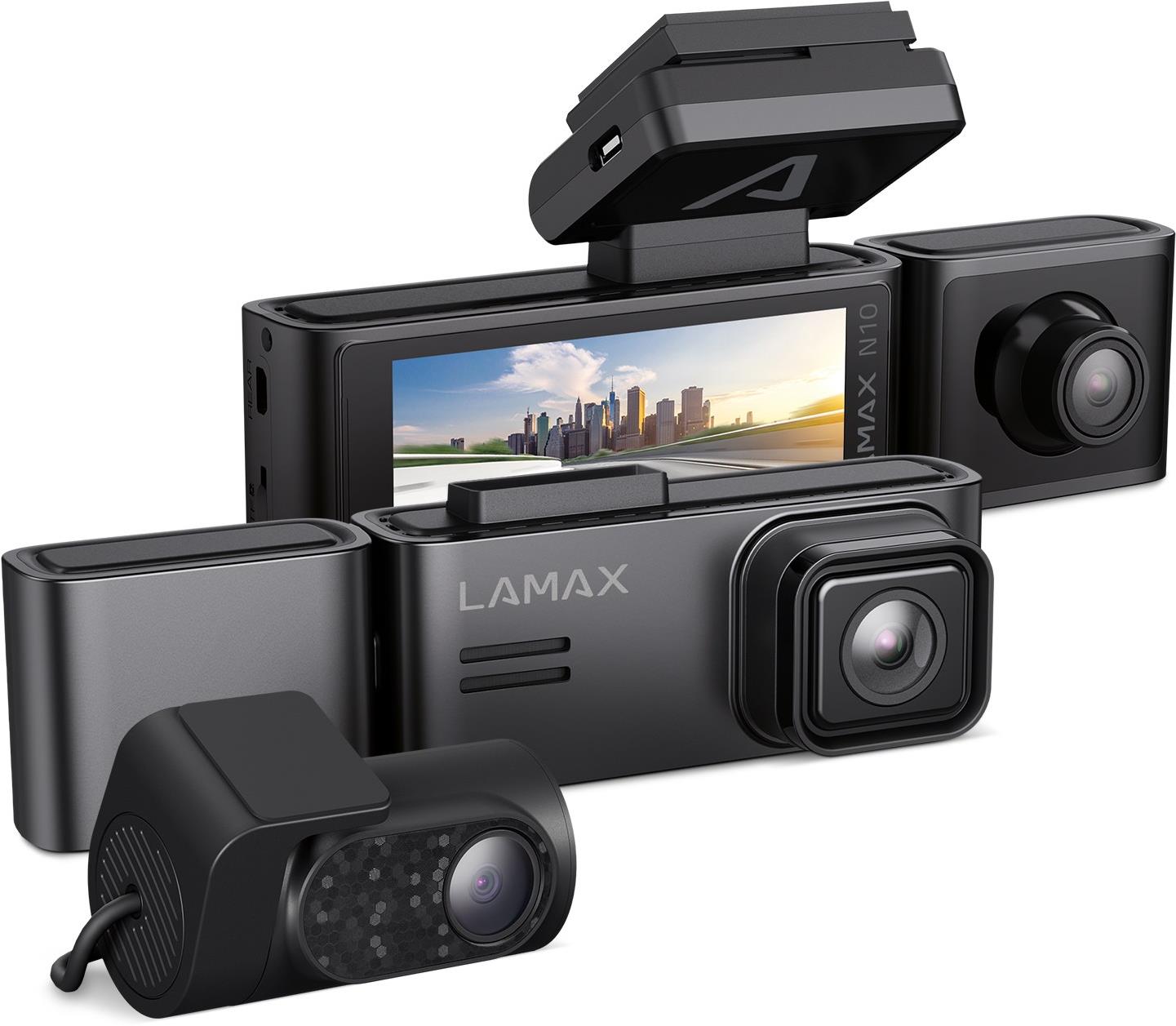 Kamera do auta – cúvacia, duálna, so senzorom CMOS, uhol záberu 150°, 3,15″ displej, GPS, nočné videnie a g-senzor, max. rozlíšenie videa Ultra HD (3840 × 2160), max. snímková frekvencia 25 sn./s, kompatibilná s pamäťovou kartou micro SD do veľkosti 256 GB, podporovaný formát MP4, rozhranie USB-C a bezdrôtové rozhranie WiFi, používateľská príručka, USB kábel, držiak a zadná kamera v balení, napájanie zaisťuje superkondenzátor Kamera do auta LAMAX N10 GPS 3 in 1Maximálna bezpečnosť na cestáchRiadenie v každodennej prevádzke prináša rôzne výzvy, či už ide o nečakané nehody alebo vandalizmus. Kamera do auta LAMAX N10 GPS 3 in