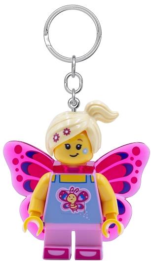 Kľúčenka – plastová, prívesok, dekorácia a svietidlo, modrá a ružová farba, výška 7,5 cm LEGO, Motýlie dievča je veľká zberateľská minifigúrka s diódami LED v oboch chodidlách, ktoré sa zapínajú stlačením hrude. Minifigúrka je pohyblivá a pripevnená k odolnému krúžku na kľúče a bude sa vy