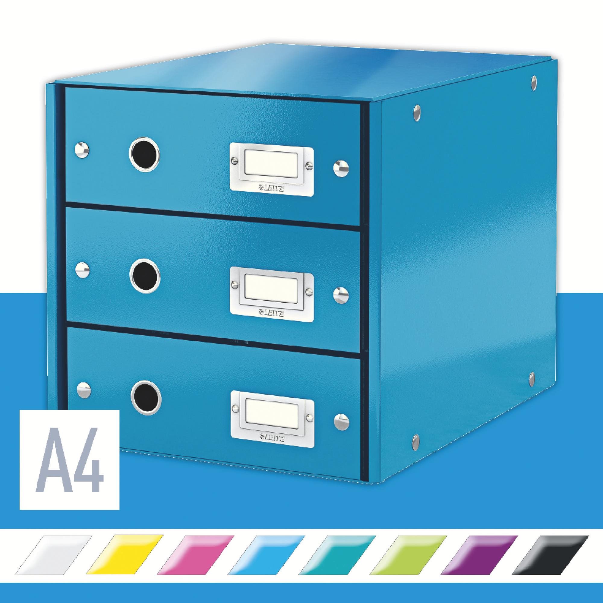Zásuvkový box – kartónový, formát A4, 3 priehradky, popisovateľné štítky a priestor na štítky, modrá farba, rozmery 28,2 × 28,6 × 35,8 cm (V׊×H), hmotnosť 2,21 kg Zásuvkový box Leitz Click & Store WOW zaistí…