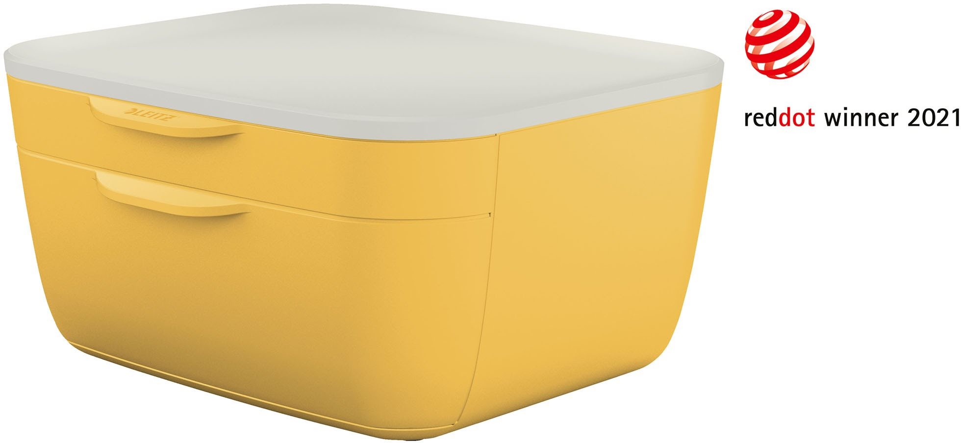 Zásuvkový box – plastový, 2 priehradky, sivá a žltá farba, rozmery 14,3 × 25,1 × 27,5 cm (V׊×H) Zásuvkový box značky Leitz z dizajnového radu COSY, ktorý ponúka rôzne produkty v troch príjemných matných farbách, ktoré sa vzájomne dobre dopĺňajú. Vďaka tomu môžete mať svoje kancelárske po