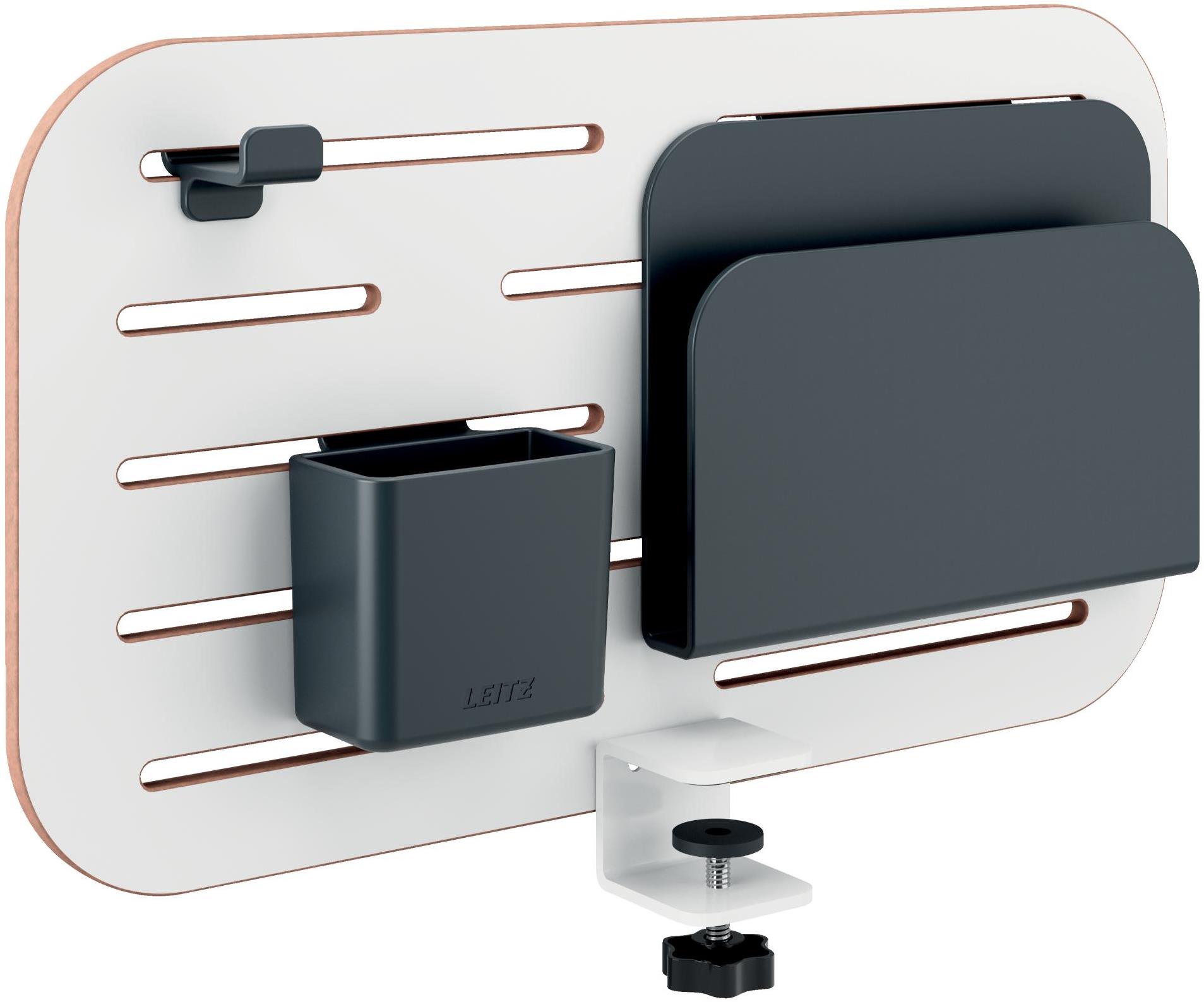 Príslušenstvo k stolu – vertikálny organizér na stôl, pre dosky stola so šírkou max. 35 mm, vertikálne usadenie pod/nad dosku stola, súčasťou balenia je držiak na blok, perá a háčik na slúchadlá, montáž bez vŕtania pomocou svoriek Dierovaný organizér Leitz Ergo Pegboard Desk Organiser vám pomôže udržať pracovný stôl uprataný a efektívne využiť dostupný priestor. Tento vertikálny organizér je možné ľahko pripevniť na vrch alebo