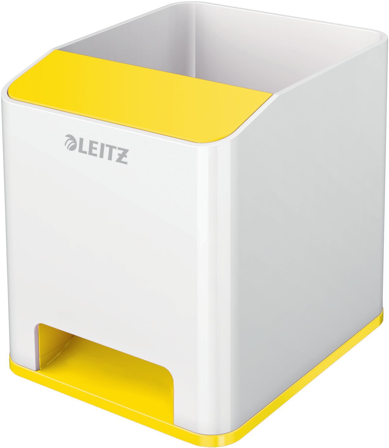 Stojanček na perá – a na ceruzky, s držiakom na telefón a konštrukciou na zosilnenie zvuku, bielo-žlté farebné vyhotovenie Vzhľadovo atraktívny aj vysoko funkčný výrobok. To je unikátny hudobný stojan na ceruzky v prémiovej kvalite značky Leitz z dizajnového radu WOW, ktorá ponúka rôzne produkty v niekoľkých žiarivých far