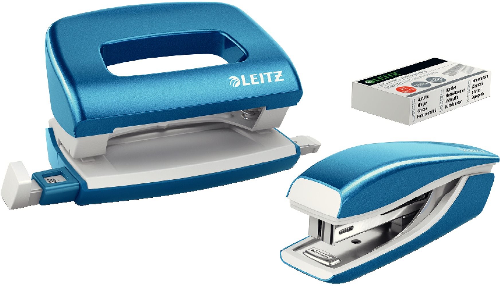 Sada kancelárskych potrieb – sada obsahuje mini zošívačku, dierovač a krabičku drôtikov P2, kompaktná veľkosť, kapacita zošívania 10 listov, otvorenie ramena o 180°, na drôtiky Leitz Power Performance P2, dierovač s ergonomickým držiakom, príložník s potlačou formátov, rámček, GS certifikácia, materiál kov a plast, modrá farba, rozmery zošívačky 101 × 30 × 39 mm, rozmery dierovača 100 × 70 × 81 mm Vzhľadovo atraktívny aj dokonale funkčný výrobok s GS certifikáciou a 10-ročnou zárukou. To je veľmi praktický mini set zošívačky a dierovačky značky Leitz z dizajnovej série WOW, ktorá ponúka rôzne p