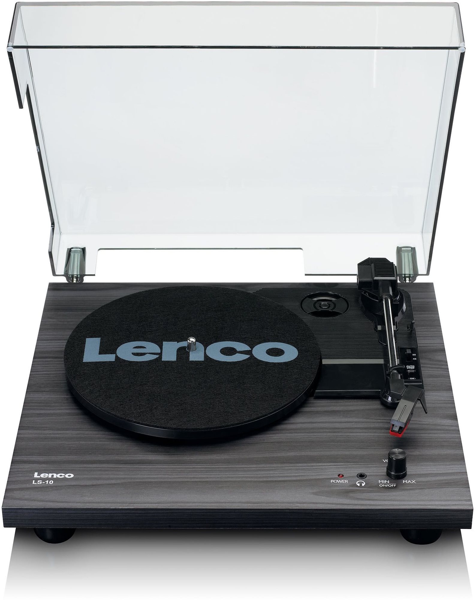 Gramofón – moderný dizajn, s reproduktormi, s krytom, vstavaný predzosilňovač, rýchlosť 33,3 a 45 otáčok za minútu, náhon remienkom, poloautomatické ovládanie, rovné ramienko, RCA výstup, slúchadlový výstup, piezoelektrická (keramická, kryštálová) prenoska, hmotnosť 2,2 kg, rozmery 318 × 103 × 329 mm (V׊×H), čierna farba Užite si počúvanie vašich obľúbených vinylových platní ľahko a rýchlo s gramofónom Lenco LS-10. Dostanete jednoduchý moderný gramofón s dvomi integrovanými reproduktormi, takže je ihneď pripravený na