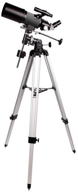Teleskop – šošovkový so zväčšením 11 – 160×, priemer objektívu 80 mm, ohnisková vzdialenosť 400 mm, limitná hviezdna veľkosť 11,62, priemer predného člena 80 mm, vnútorný priemer okulárov 1,25 mm, hvezdárske príslušenstvo, statív, hvezdárske príslušenstvo a statív súčasťou, paralaktická montáž, výška 123 cm, hmotnosť 6 kg, sivá farba Hviezdársky ďalekohľad Levenhuk Blitz 80s PLUS je achromatický refraktor s krátkou ohniskovou vzdialenosťou a širokým zorným poľom, ktorý obraz vykresľuje vo vysokom rozlíšení. Vzhľadom na v