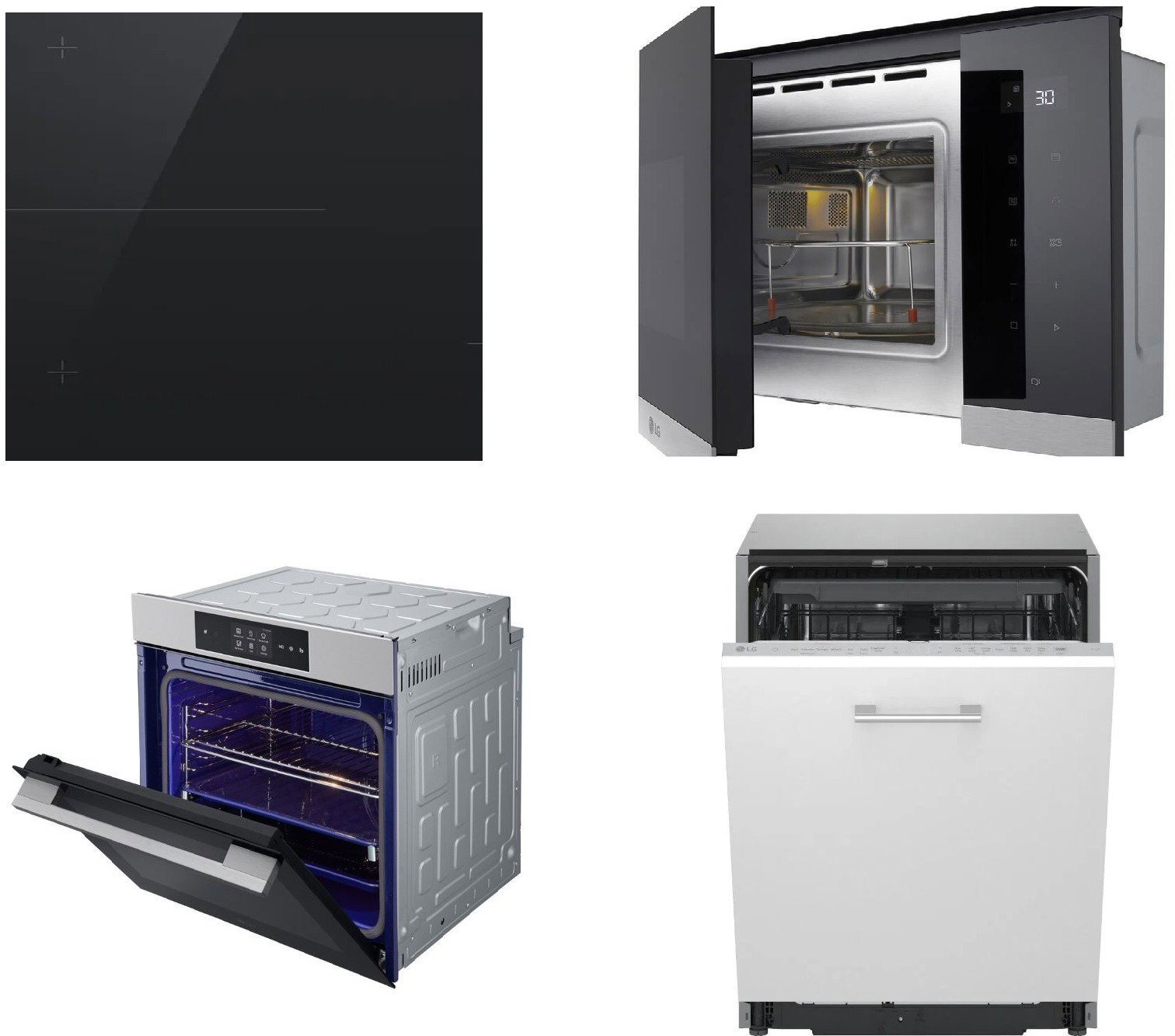 Set mikrovlnná rúra, vstavaná umývačka, vstavaná rúra a varná doska – mikrovlnná rúra: mikrovlnný gril 2v1, výkon 900. W, objem 25l, dotykové ovládanie, biely LED displej, 4 režimy varenia, 8 automatických programov, rýchly štart a tlačidlo…