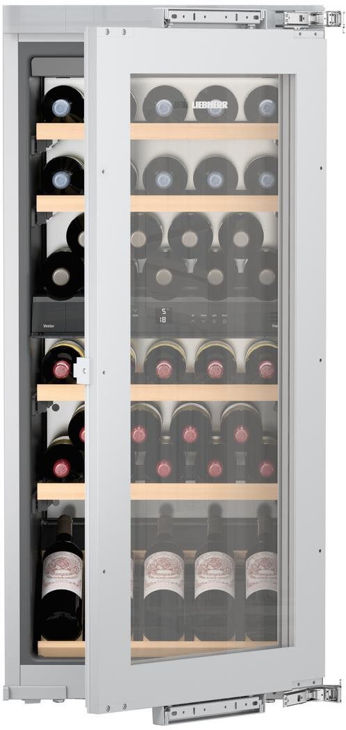Vstavaná vinotéka – energetická trieda G, na 48 fliaš, vnútorný objem 159 l, 2 zóny chladenia, 6 políc, vo výbave varovný signál pri poruche, alarm otvorených dverí a automatické odmrazovanie, displej, osvetlenie a možnosť zmeny otvárania dvierok, dotykové ovládanie, hlučnosť 32 dB, pravé otváranie, rozmery 121,8 × 55,7 × 55,3 cm (V׊×H), hmotnosť 64 kg, strieborná farba Vstavaná vinotéka LIEBHERR EWTdf 2353 v elegantnom striebornom vyhotovení patrí medzi temperované chladničky radu Vinidor. Ponúka vnútorný objem 159 litrov, šesť drevených políc a kapacitu až pre 48 f