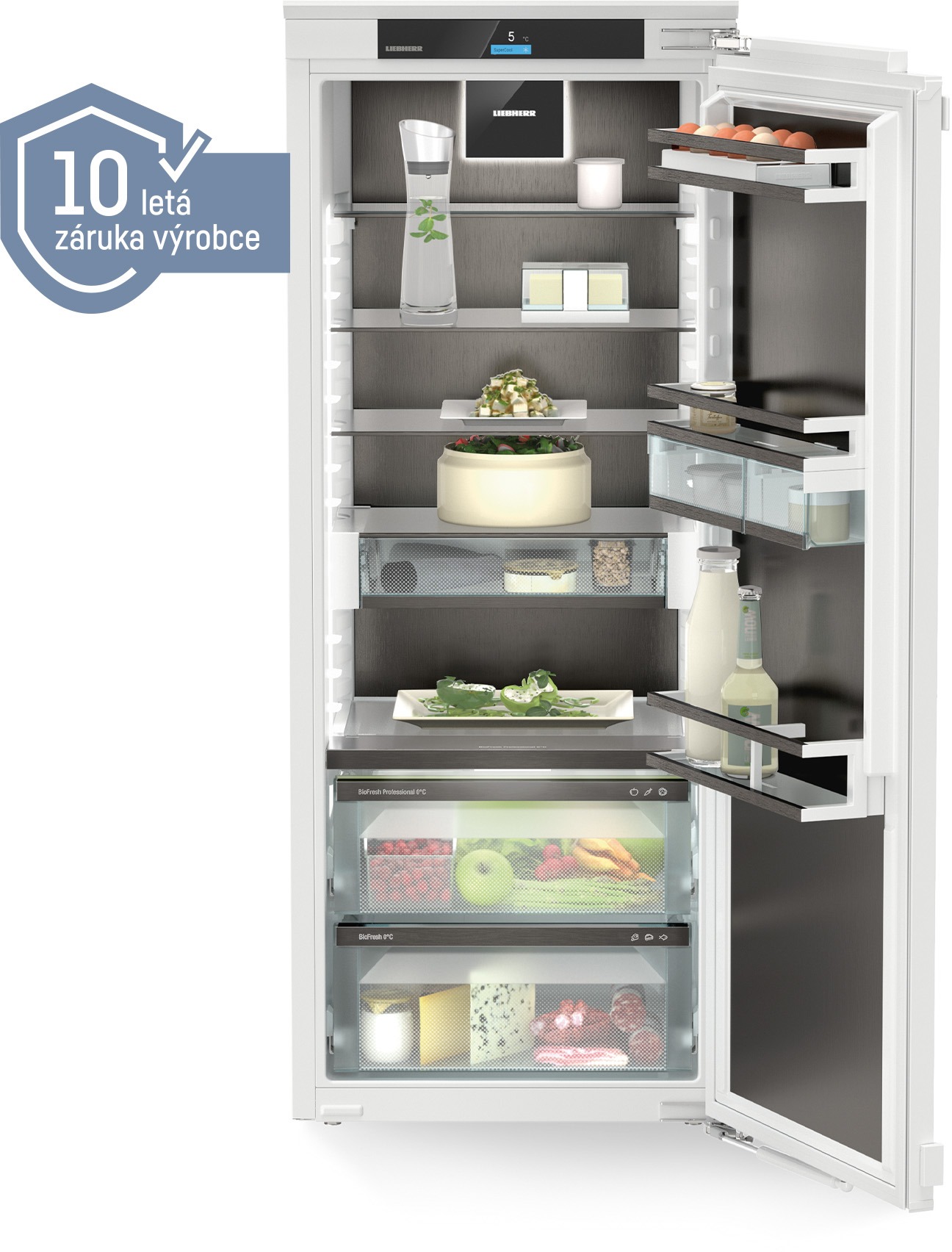 Vstavaná chladnička – bez mrazničky, energetická trieda B, objem chladničky 225 l, doprava, 8 políc, 1 chladiaci okruh, smart funkcie, rozmery 139,5 × 55,9 × 54,6 cm (V׊×H), čelný dekoratívny panel na dvierkach nie je súčasťou dodávky Vstavaná chladnička LIEBHERR IRBbsbi 4570 s pevnými dverami a 115° uhlom na otvorenie dverí. Chladnička s celkovým objemom 224 litrov aenergetickou triedou B sa pýši ročnou spotrebou 73 kWh. Chladiaca