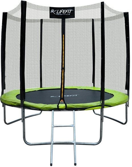 Trampolína – s priemerom 244 cm, nosnosť 100 kg, nad zem, ochranná sieť, schodíky a krytie pružín súčasťou, materiál konštrukcie galvanizovaná oceľ, materiál plochy na skákanie polypropylén, výška 221 cm, výška rámu 68 cm, 3 nohy, čierna, strieborná a zelená farba Trampolína Lifefit 8’/244 cm s odolnou konštrukciou, pevnou ochrannou sieťou odolnou voči UV žiareniu a rebríkom sa vyznačuje jednoduchou montážou a je vhodná na exteriérové využitie detí i dospelých.