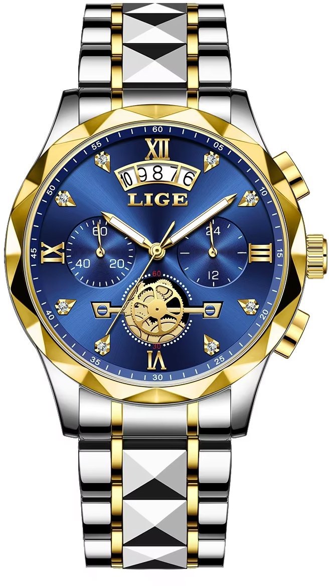 Hodinky pánske – analógové zobrazenie času, strojček quartz, okrúhly ciferník, elegantné, rímske indexy, minerálne sklíčko, materiál puzdra oceľ, zlatá farba puzdra, materiál remienka oceľ, strieborná farba remienka, s vymeniteľným remienkom Lige 89193 + darček sú pekné pánske hodinky vhodné na každodenné nosenie. Takzvané Quartz riešenie strojčeka je synonymom vysokej životnosti batérie a presnosti merania. Materiál remienka tvorí oceľ,