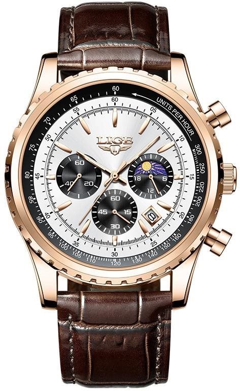 Hodinky pánske – analógové zobrazenie času, strojček quartz, okrúhly ciferník, 12/24-hodinový formát, dátum, chronograf a stopky, elegantné, arabské indexy, minerálne sklíčko, vodotesnosť 30 m (3 ATM), materiál puzdra nehrdzavejúca oceľ, biela farba puzdra, materiál remienka koža, hnedá farba remienka, na maximálny obvod zápästia 22 cm, s vymeniteľným remienkom Lige Man 8989-10 rose gold silver sú úchvatné pánske hodinky, s ktorými zaručene zaujmete svoje okolie. Tvorí ich okrúhly ciferník s priemerom 46 mm. Strojček s technológiou Quartz dáva istotu vysokej