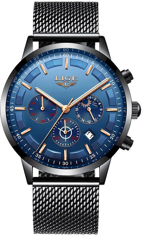 Hodinky pánske – analógové zobrazenie času, strojček quartz, okrúhly ciferník, dátum, luminiscenčné prvky a stopky, elegantné, arabské indexy, vodotesnosť 30 m (3 ATM), materiál puzdra nehrdzavejúca oceľ, čierna farba puzdra, materiál remienka nehrdzavejúca oceľ, čierna farba remienka LIGE MAN 9877B sú kvalitné pánske hodinky, ktoré zaujmú prepojením štýlu a funkčnosti. Nájdete na nich okrúhly ciferník s veľkosťou 44 mm. Strojček Quartz je zárukou vysokej životnosti batérie a pres
