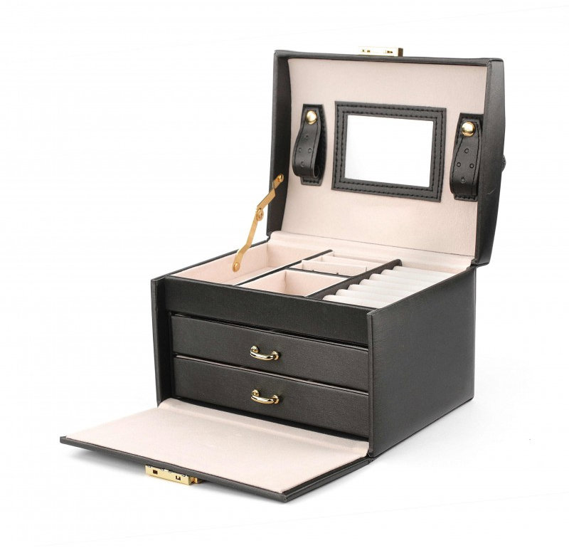 Šperkovnica – zo syntetickej kože, box (klasická), s otváraním, so zrkadlom, 3 poschodia, 2 zásuvky, rozmery 15 × 10 × 10 cm (V׊×H), čierna farba Šperkovnica LIVEFY ponúka bezpečné miesto pre vaše klenoty. Vďaka syntetickej koži je nielen štýlová, ale aj jednoducho udržiavateľná. Nenahraditeľným pomocníkom pri úprave vášho zovňajšku bude prakti