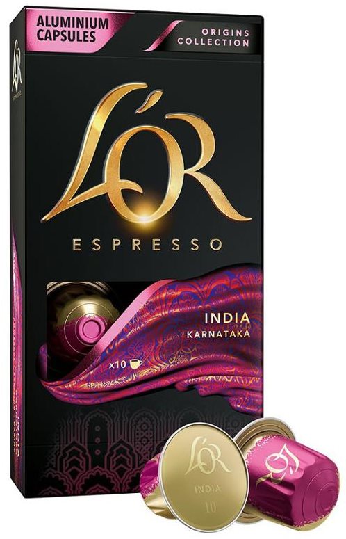 Kávové kapsuly – na káva bez sušeného mlieka, 100 % arabica, dark (intenzita 10), ovocné a korenené tóny, pôvod kávy India, veľkosť šálky Espresso, materiál kapsuly hliník, 10 kapsúl v balení L’OR India10 kapsúlŽivé farby evokujúce krajinu Karnátaka sú zachytené v káve India. Silná, napriek tomu jemná zmes korenistých a ovocných tónov, ktorá prináša vzrušujúce vône a požitky miestnych bazá