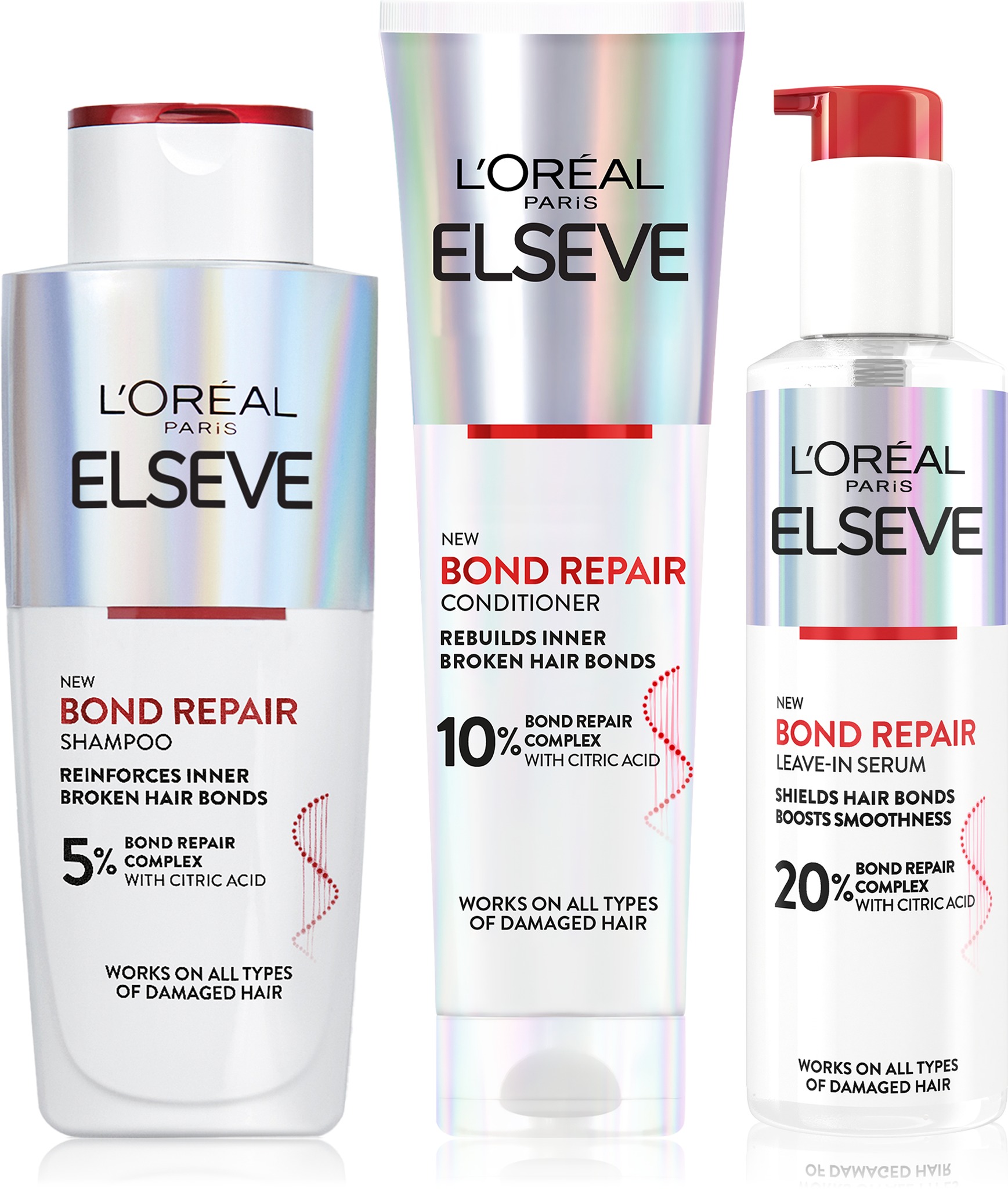 Sada vlasovej kozmetiky – šampón na vlasy 200 ml + sérum na vlasy 150 ml + regeneračný balzam na vlasy 150 ml Súprava produktov L’ORÉAL Paris Elseve Bond RepairSúprava L’ORÉAL PARIS Elseve Bond Repair je kompletná starostlivosť určená na obnovu a posilnenie vlasových väzieb. Obsahuje šampón na vlasy, sérum na