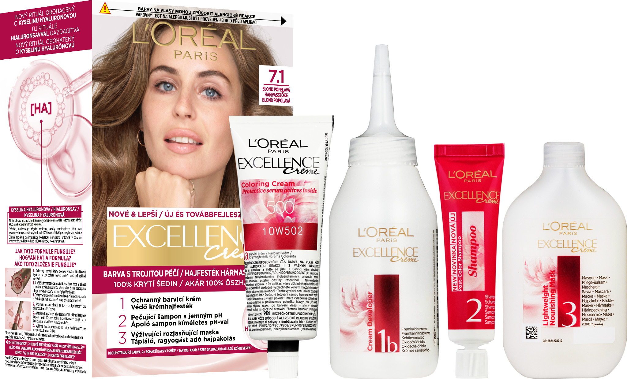 Farba na vlasy – blond, permanentná, krémová, vyhotovenie: vegan, korekciu odrastov alebo šedín, na všetky typy vlasov, odhadovaná výdrž až 6 týždňov, rukavice, aplikátor, vlasová výživa a návod v balení EXCELLENCE KRÉMOVÁ PERMANENTNÁ FARBA NA VLASYL’ORÉAL PARIS Excellence predstavuje farbiaci rituál s trojitou starostlivosťou, obohatenú o kyselinu hyalurónovú. Táto inovatívna formula sa stará nielen