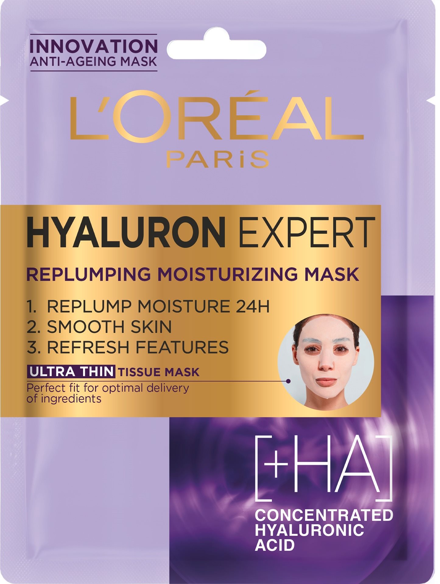 Pleťová maska – denný a nočný variant, účinok hydratačný a proti vráskam, unisex, doba pôsobenia 15 min, aktívne látky kyselina hyalurónová, na mastnú, normálnu, zmiešanú, suchú a zrelú pleť Pleťová maska L’ORÉAL PARIS Hyaluron Specialist Replumping Moisturizing poskytuje okamžitú hydratáciu a vyhladenie jemných vrások. Vyrobená z japonskej bavlny, ktorá vďaka svojej tenkosti dokonale pri