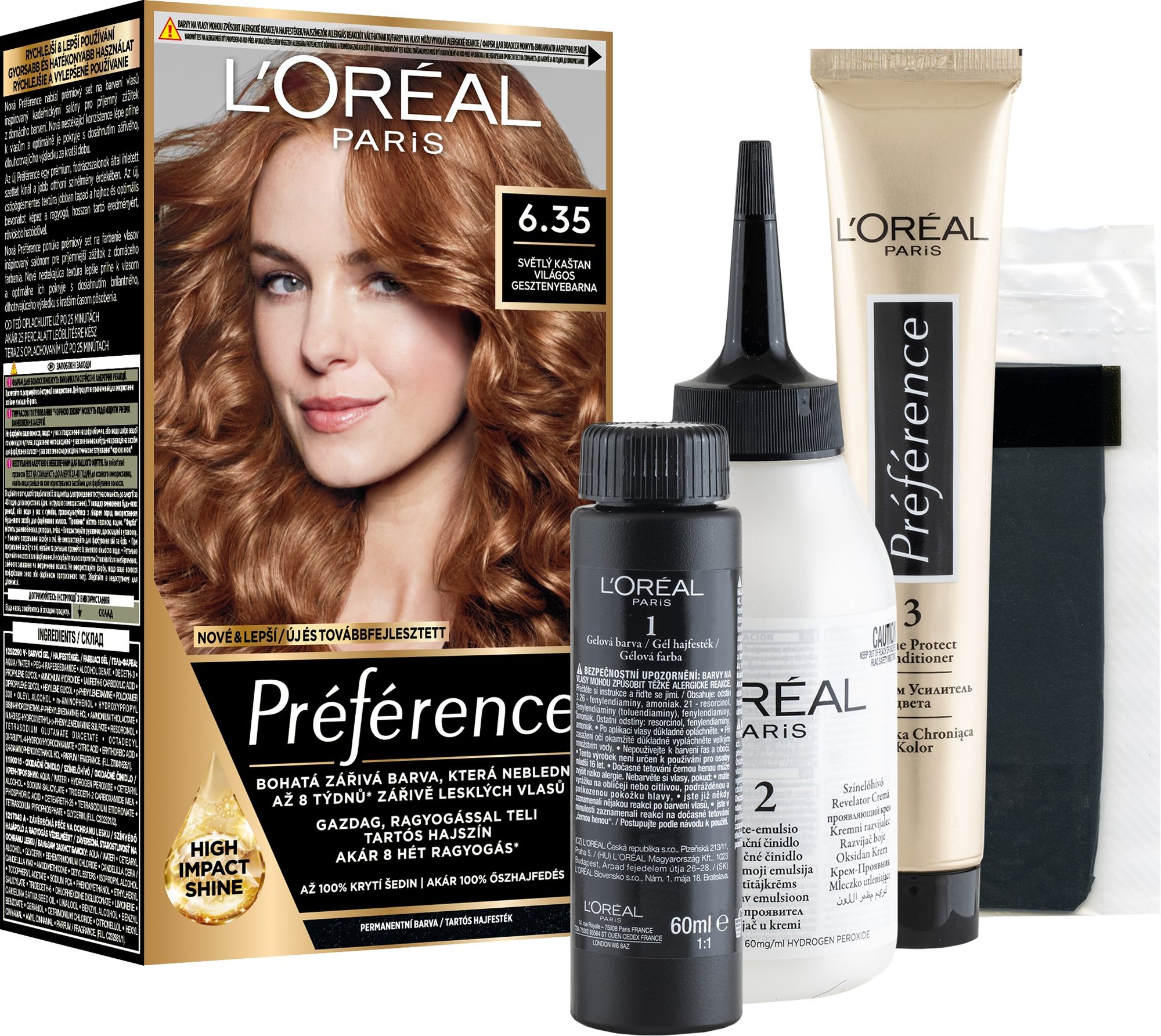 Farba na vlasy – hnedá, permanentná, tekutá, korekciu odrastov alebo šedín, na všetky typy vlasov, odhadovaná výdrž až 8 týždňov, rukavice, vlasová výživa a návod v balení L’ORÉAL PARIS Préférence – Žiarivá farba vlasov, ktorá vydržíLuxusného farebného výsledku docielite vďaka tejto legendárnej dlhotrvajúcej farbe L’ORÉAL PARIS Préférence s vysoko odolnými farbiacimi zl