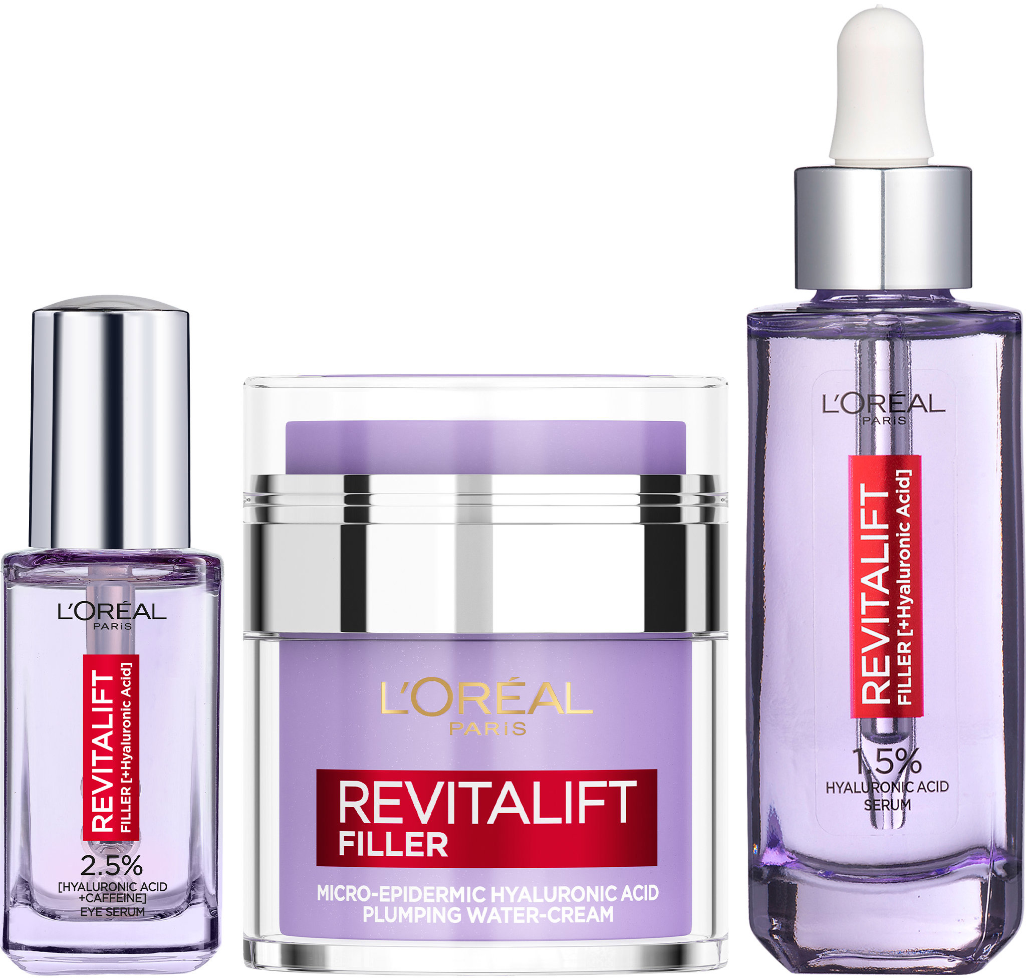 Darčeková sada kozmetiky – obsahuje: Pleťový krém 50 ml, Pleťové sérum 30 ml, Očné sérum 20 ml Antiaging darčeková sada L’Oréal Paris Revitalift Filler Set obsahuje hydratačné sérum s 1,5 % čistej kyseliny hyalurónovej, očné sérum s 2,5 % kyseliny hyalurónovej a kofeíno