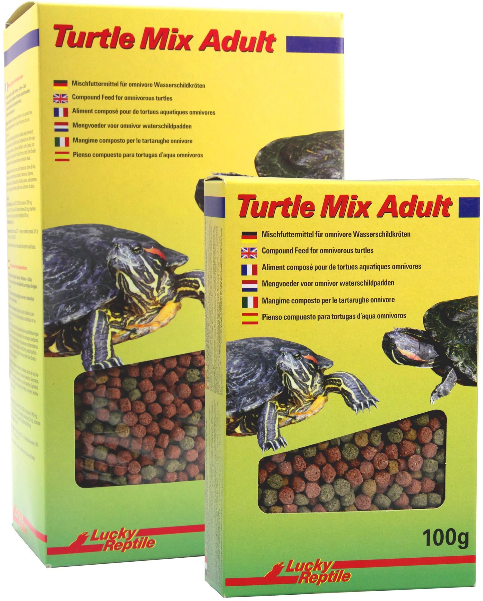 Krmivo pre teráriové zvieratá – základné krmivo, typom krmiva sú granuly, určené pre plazy a vodné korytnačky, hmotnosť 0,6 kg Zmes Lucky Reptile Turtle Mix Adult slúži ako krmivo pre dospelé vodné korytnačky. Obsahuje rybiu múčku, kukuričnú, sójovú aj ryžovú múku, kvasnice, pšeničný proteín, kôrovce, ako sú garnáty, Gammarus