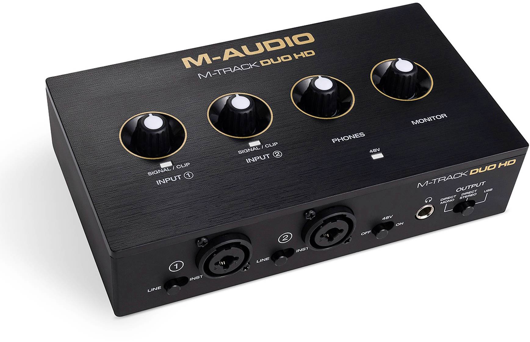 Externá zvuková karta – pripojenie cez USB-C, vhodná na nahrávanie hudby, Phantomové napájanie +48 V, s LED indikáciou, vrátane mikrofónových predzosilovačov, s potenciometrami, funkcia: nastavenie hlasitosti a nastavenie citlivosti, bitová hĺbka 24, vstup 2× Jack 6,3 mm, 2× XLR, 2× Hi-Z, výstup 2× Jack 6,3 mm, vrátane kábla s konektorom USB-C, softvér súčasťou balenia, s manuálom M-Audio M-Track Duo HDProfesionálny zvuk, ktorý je dostupný pre každéhoM-Audio M-Track Duo HD je kompaktná USB-C zvuková karta 2-in/2-out, ktorá spája jednoduchosť, spoľahlivosť a špičkový z