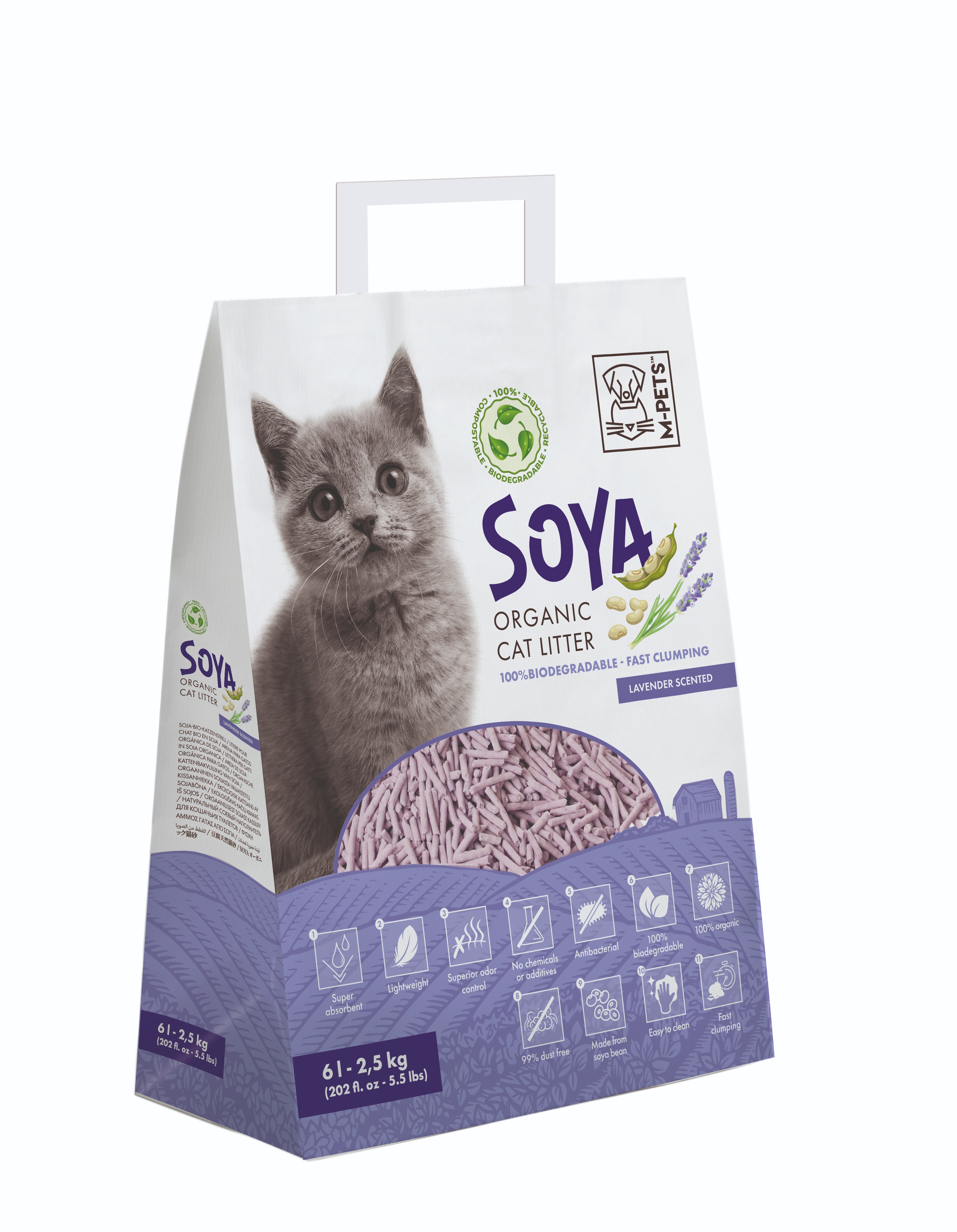 Podstielka pre mačky – sójová, s vôňou, ekologická a vysoko absorpčná, 2,5 kg/6 l Stelivo pre mačky SOYA Cat LitterVysoko absorpčná sójová podstielka s vôňou levandule 2,5 kg/6 lDoprajte svojim domácim miláčikom kvalitné stelivo pre mačky SOYA Cat Litter s prírodnou vôňou levandule