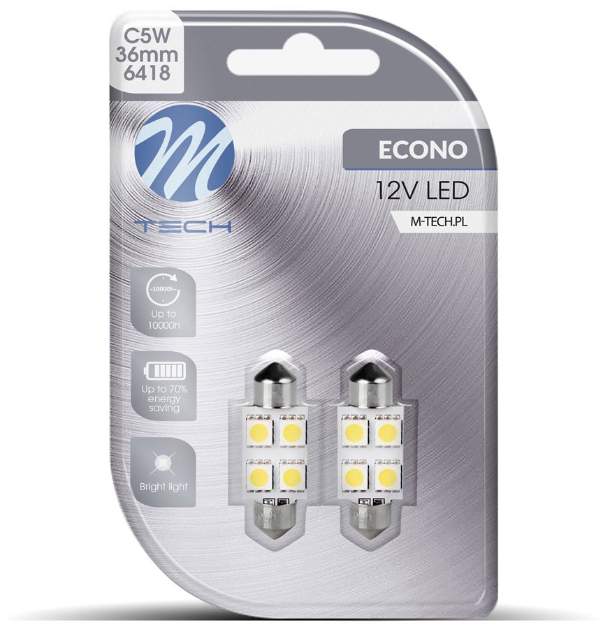 LED autožiarovka C5W – pätica SV8.5, na osvetlenie EČV, osvetlenie interiéru a osvetlenie kufra, výkon 0,73 W, napätie 12 V, svetelný tok 50 lm, 4 LED žiarovky, biela farba svetla, 2 autožiarovky v balení, off-road použitie, výbojka nemá homologizáciu na použitie na pozemnej komunikácii LED žiarovka do auta M-Tech s výkonom 0,73 W sa hodí ako náhrada obyčajnej žiarovky a využijete ju najmä na osvetlenie EČV, osvetlenie interiéru a osvetlenie kufra. Oproti klasickej halogénovej žiarov