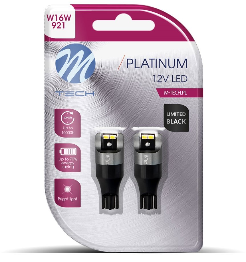 LED autožiarovka W16W – pätica W2.1×9.5d, na zadné smerovky, cúvacie svetlá a osvetlenie kufra, výkon 1,9 W, napätie 12 V, svetelný tok 210 lm, 4 LED žiarovky, biela farba svetla, 2 autožiarovky v balení, off-road použitie, výbojka nemá homologizáciu na použitie na pozemnej komunikácii LED žiarovka do auta M-Tech s výkonom 1,9 W poslúži ako náhrada obyčajnej žiarovky a je využiteľná najmä na zadné smerovky, cúvacie svetlá a osvetlenie kufra. Má úspornejšiu prevádzku v porovnaní s ha