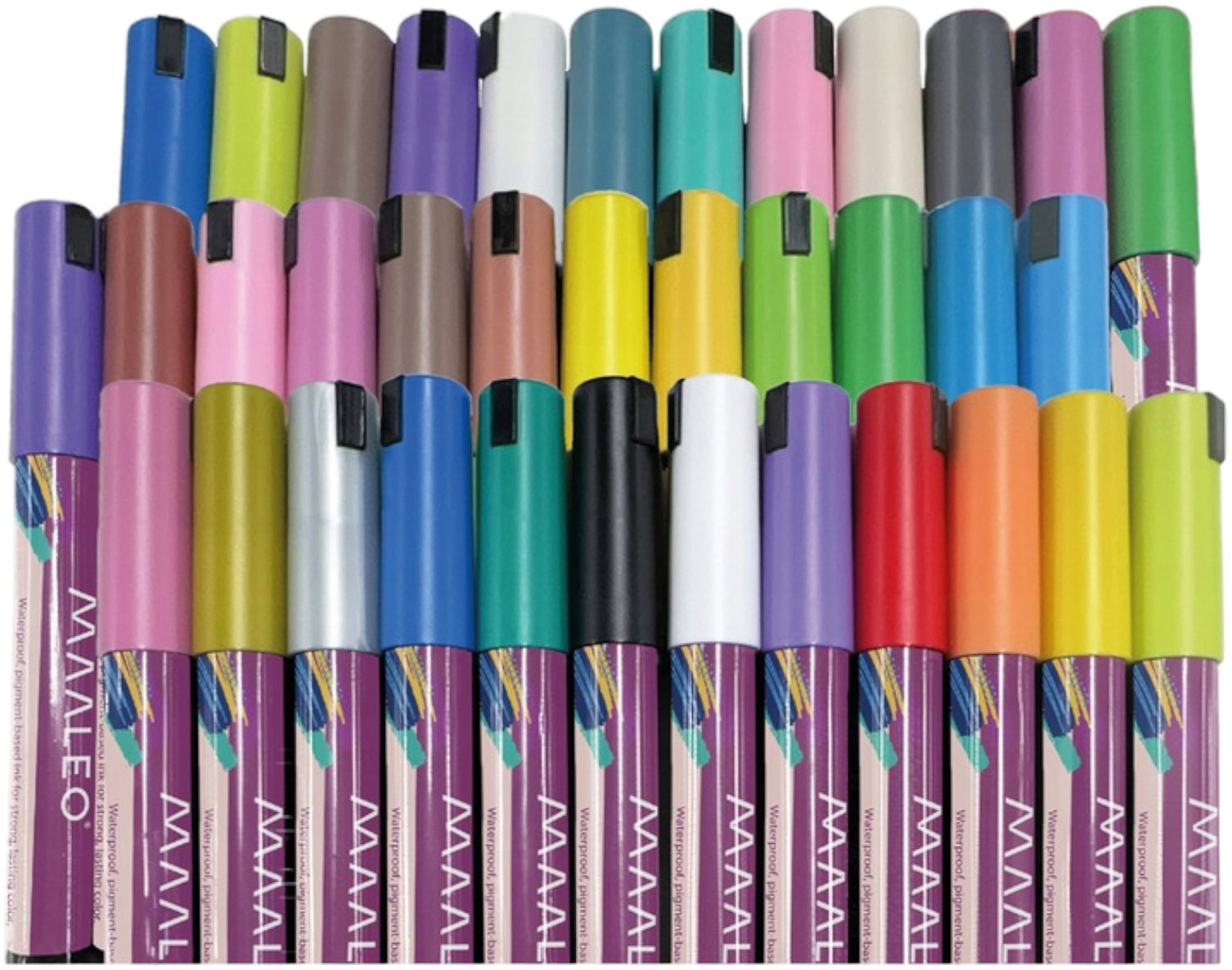 Fixky – na textil, porcelán, papier a nábytok, akrylové, okrúhly úchop, guľatý tvar hrotu, šírka stopy 1,5 mm, škatuľka a 36 fixiek v balení Vo vašej sade maliarskych potrieb nesmú chýbať fixky Maaleo. Ich okrúhly tvar sa ľahko drží, a tak sa bude s nimi dobre pracovať. Fixky s hrotom so šírkou 1,5 mm sa postarajú o krásne výrazné ťahy pri