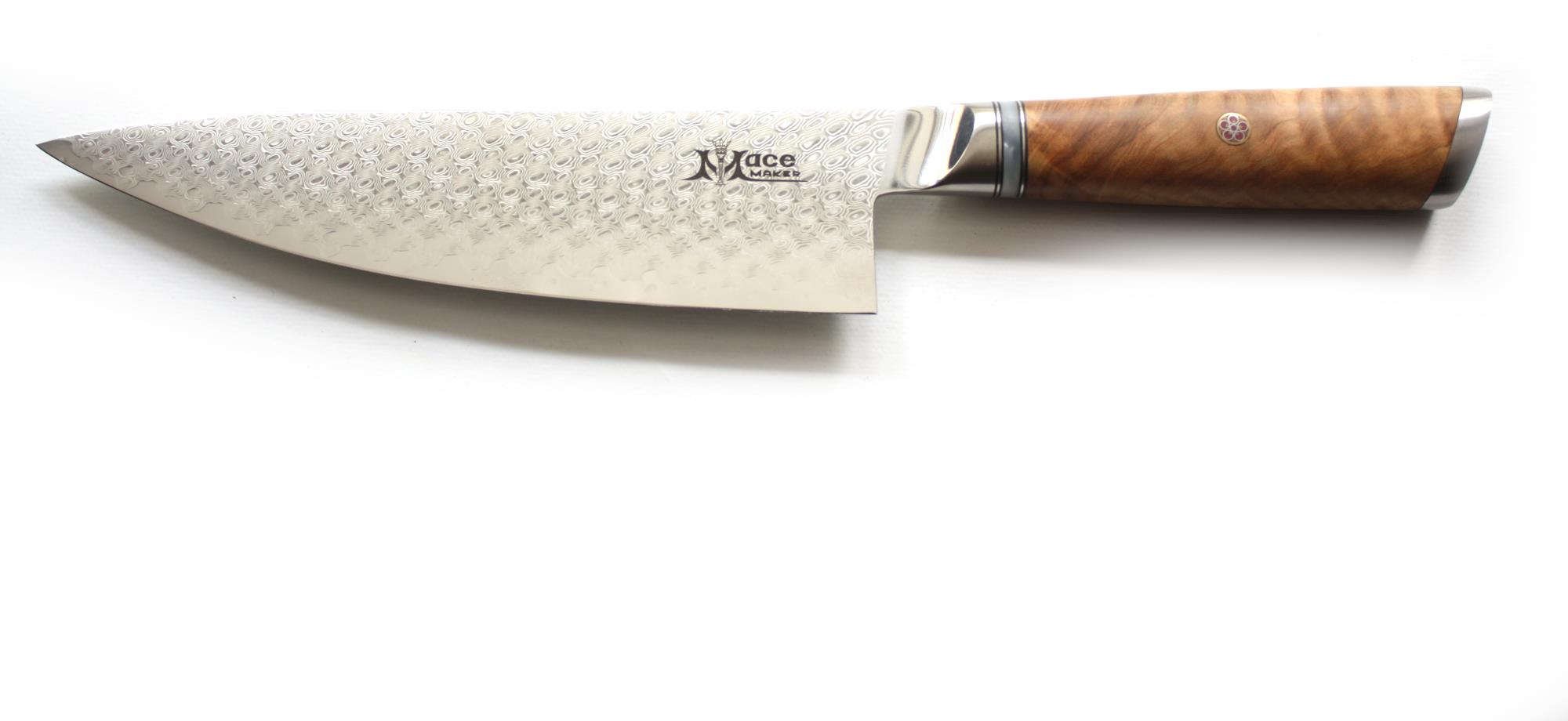 Kuchynský nôž – materiál čepele: damascénska oceľ, dĺžka čepele 20 cm, japonský nôž, kuchársky nôž a univerzálny nôž, materiál rukoväti: drevo Skvelý kuchynský nôž sa stane perfektným doplnkom každej kuchárskej výbavy. Univerzálny nôž od značky MaceMaker sa výborne hodí na krájanie všetkých typov potravín. Má veľmi ostrú čepeľ vyrobenú z poc