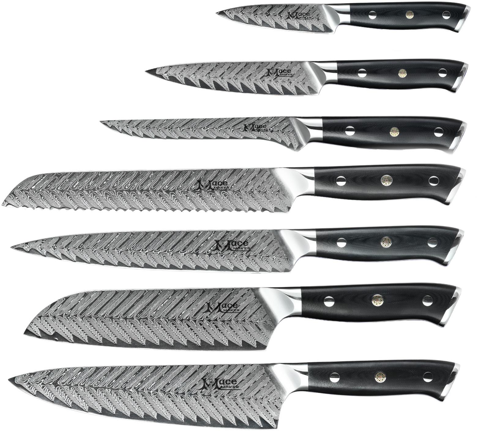 Sada nožov – japonský nôž, kuchársky nôž, nôž na chlieb, univerzálny nôž a vykosťovací nôž, materiál rukoväti drevo, materiál čepele damascénska oceľ, 7 kusov v súprave Mali by ste záujem zaobstarať si veľkú sadu nožov, vďaka ktorej budete schopní krájať čokoľvek? Potom vám určite príde vhod súprava nožov MaceMaker, ktorá patrí do základnej výbavy každej kuchyne. V t