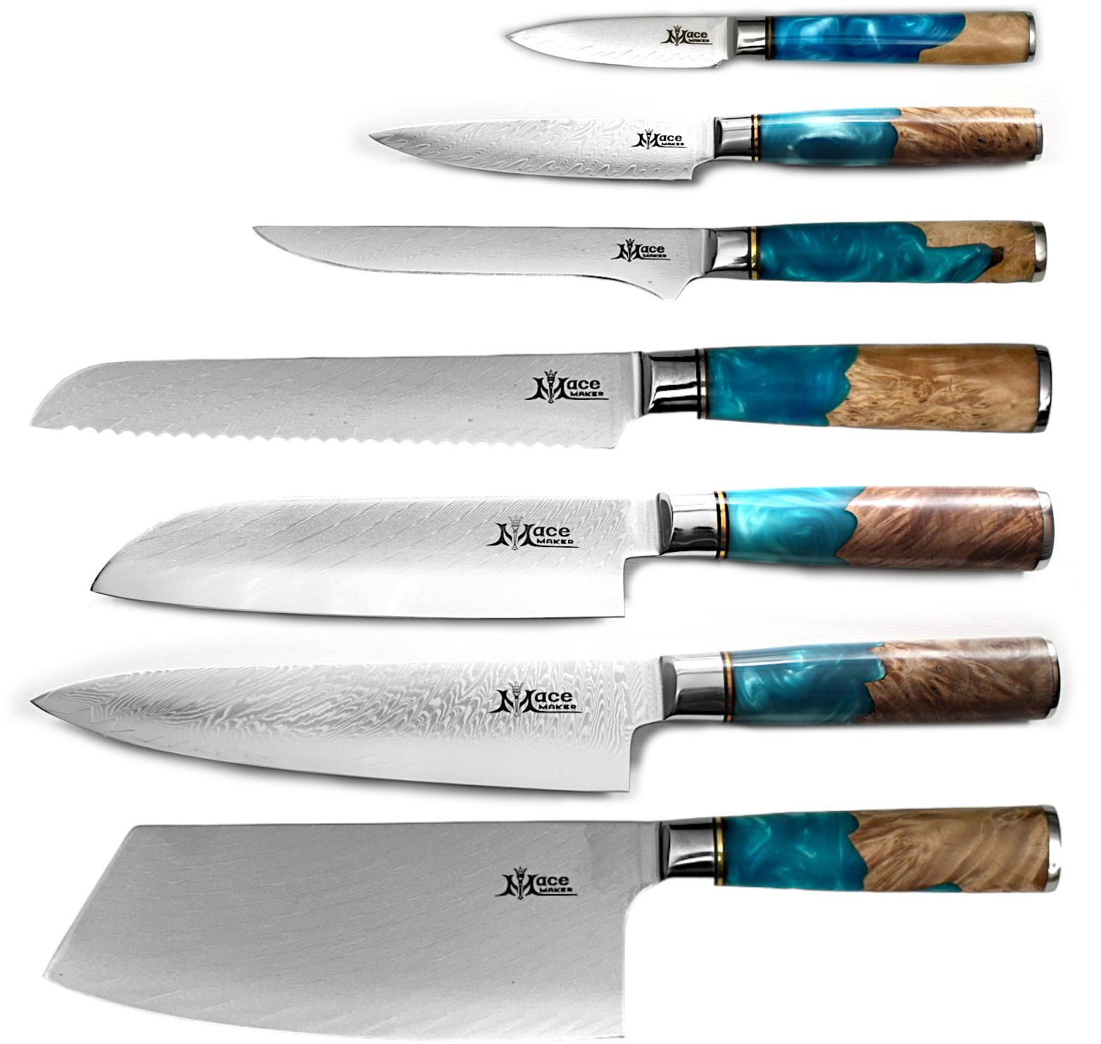 Sada nožov – japonský nôž, kuchársky nôž a univerzálny nôž, materiál rukoväti drevo, materiál čepele damascénska oceľ, 7 kusov v súprave Túžite po sade nožov, s ktorou budete môcť krájať každú potravinu? Potom sa vám určite bude hodiť súprava nožov MaceMaker, ktorá sa ujme v každej domácnosti. Táto sada zahŕňa japonský nôž, kuchársky n