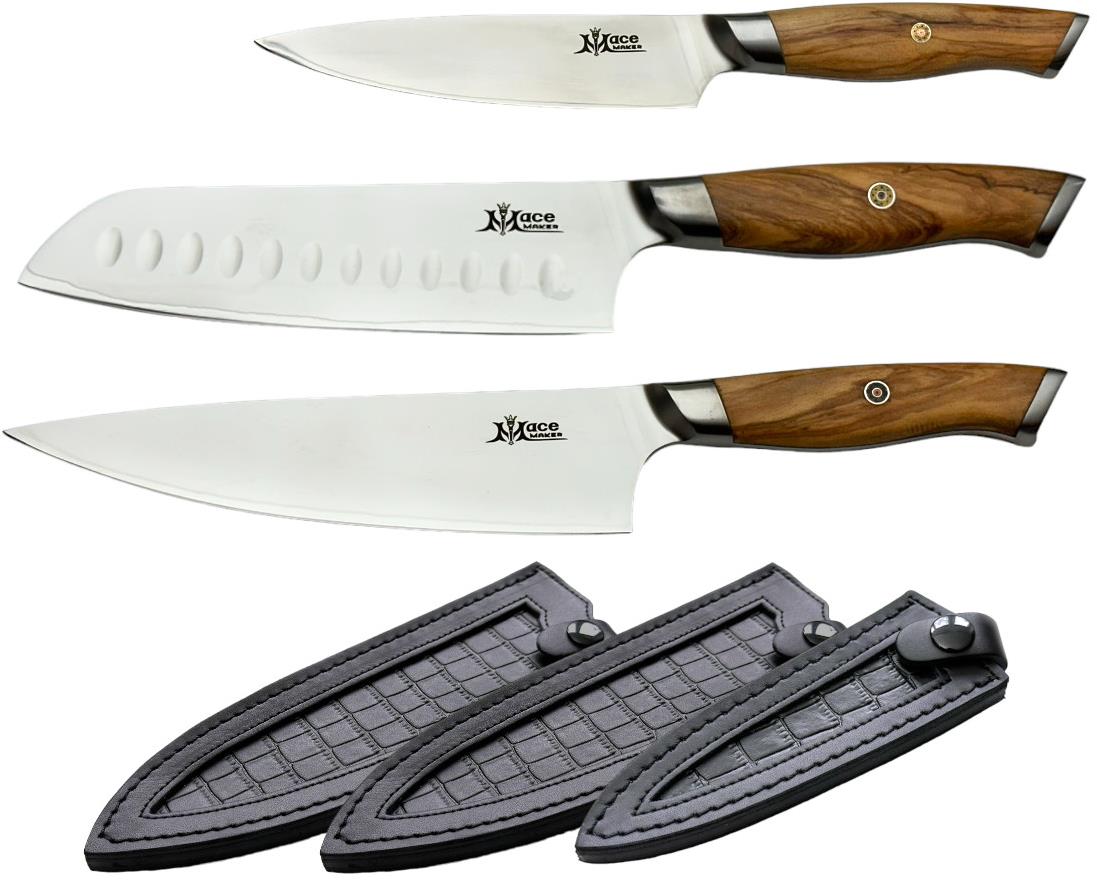 Sada nožov – japonský nôž, kuchársky nôž a univerzálny nôž, materiál rukoväti drevo, materiál čepele nehrdzavejúca oceľ, 3 kusy v súprave Mali by ste záujem zaobstarať si veľkú sadu nožov, s ktorou budete môcť krájať každú potravinu? V tom prípade je práve pre vás ako stvorená súprava nožov MaceMaker, ktorá je pre každú domácnosť nevyhn