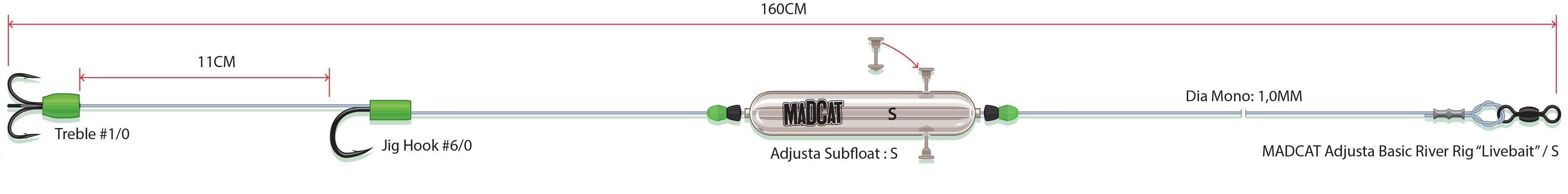 Montáž – s podvodným plavákom Adjusta Subfloat, na rybárčenie s živými nástražnými rybkami na dne rýchlo tečúcich riek, dĺžka: 160cm, nosnosť: 100lb, hmotnosť: 20g MADCAT Adjusta Basic River Rig „Livebait“ predstavujú jednoduché, ale veľmi efektívne montáže, s ktorých pomocou sa môžete ihneď po nadviazaní pustiť do rybolovu. Montáže sú opatrené dutým pod