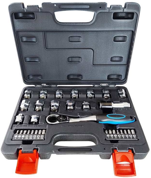 Gola sada – bity, nadstavce a iné ručné náradie v balení, kufrík súčasťou, 32-dielna, 1/4″ a 3/8″ štvorhran, dvanásťhranný profil hlavíc, plastová rukoväť, ergonomické úchopy, celková dĺžka račne 190 mm Gola sada Magg obsahuje 32 komponentov. Sada je vybavená štvorhranom s veľkosťou 1/4″ a 3/8″. Hlavica s dvanásťhranným profilom zaisťuje jednoduchú manipuláciu na tesných miestach. Ergonomický úchop z