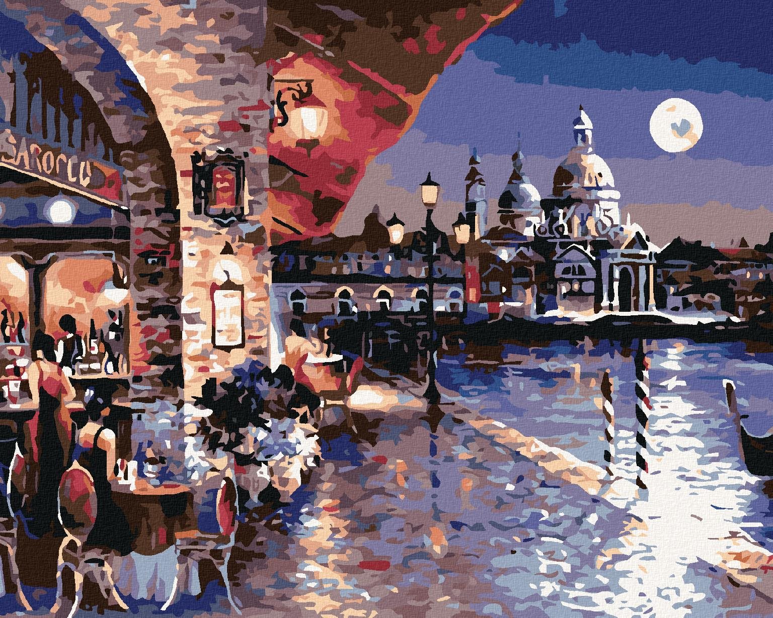 Maľovanie podľa čísel – tematika mestá a miesta, plátno, súprava štetcov, farby a vymaľovaný vzor súčasťou balenia, rozmery 80 × 100 cm (V׊) Kľúčové vlastnosti maľovania podľa čísiel Maľovanie podľa čísel – Nočné Benátky, 100 × 80 cm, bez rámu a bez napnutia plátna Maľovanie podľa čísel je vhodné pre všetkých tvorivých ľudí Materiálom plát