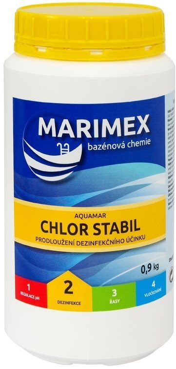 Bazénová chémia vhodná pre bazény, regulácia pH, hmotnosť 0,9 kg MARIMEX CHLOR STABIL obsahuje 100 % kyselinu kyanurovú. Po nasypaní stabilizátora do skimmera kyselina bráni rozptylu chlóru. Prípravok znižuje straty chlóru spôsobené UV žiarením a dokáže tak ušetriť