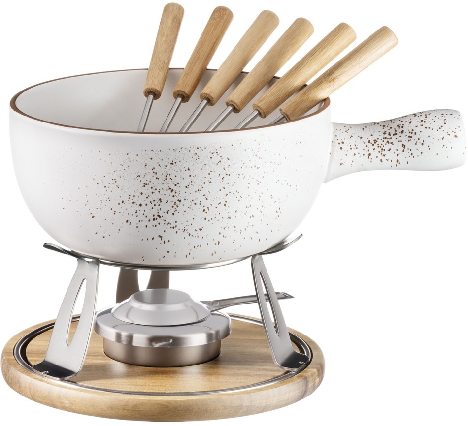 Fondue – určené na slané varianty, vhodné pre 6 osôb, ohrievanie gélovým horákom, materiál porcelán Fondue set na syr Mäser PINTAR je štýlová sada inšpirovaná tradičným syrovým fondue, ktorá vyniká vintage dizajnom a harmonickým spojením krémovej glazúry s jemnými hnedými bodkami. Moderne zaoblené t