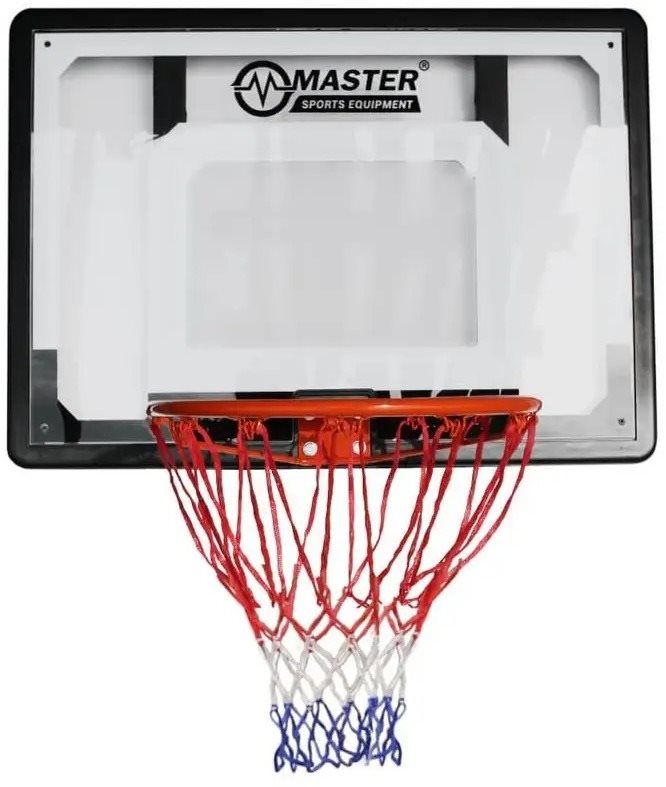 Basketbalový kôš – s doskou, na stenu, vhodný do interiéru, na lopty veľkosti 7, priemer obruče 38 cm, rozmery dosky 58 × 80 cm (V׊), hmotnosť 4,5 kg, materiál dosky polykarbonát, materiál konštrukcie oceľ Basketbalový kôš MASTER je vhodný na montáž na stenu. Tvorený je doskou a obrúčkou so sieťkou . Obrúčka disponuje priemerom 38 cm a je určená pre lopty do veľkosti 7. Doska je vyrobená z polyk
