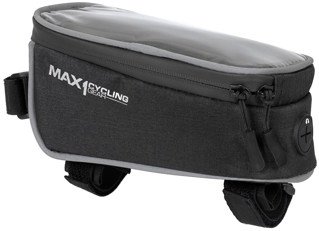 Taška na bicykel – na rám, objem 0,85 l, vodoodolná, umývateľná, vo výbave suché zipsy, horné vrecko, vrecko na mobilný telefón, reflexné prvky, otvor na slúchadlá a ochrana telefónu pred vlhkosťou, rozmery 11 × 11 × 22 cm (V׊×H), hmotnosť 0,146 kg, čierna farba MAX1 Mobile One reflex je praktická rámová taška s objemom 833 cm³, navrhnutá na umiestnenie na hornú rámovú rúrku. Je vybavená vreckom na mobilný telefón s vodoodolnou dotykovou membránou, ktorá umož