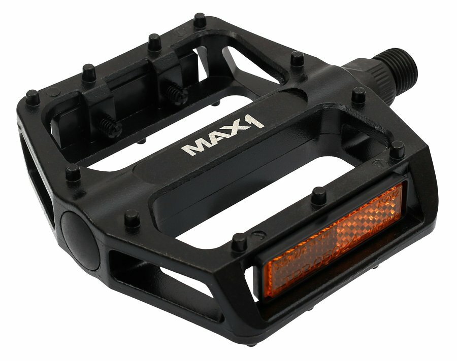 Pedále – na horské bicykle (MTB), BMX, zjazdové bicykle (Downhill), mestské bicykle, gravel bicykle a trekové bicykle, platformy, bez zámku, integrované odrazky, materiál hliník, pevné piny, rozmery 120 × 100 mm (Š×H), hmotnosť 448 g, čierna farba Celohliníkové pedále MAX1 BMX sú určené na použitie na zjazdové bicykle (Downhill), mestské bicykle i gravel bicykle. Pedále typu platformy disponujú širšou základňou ako klasické pedále a vďaka pinom