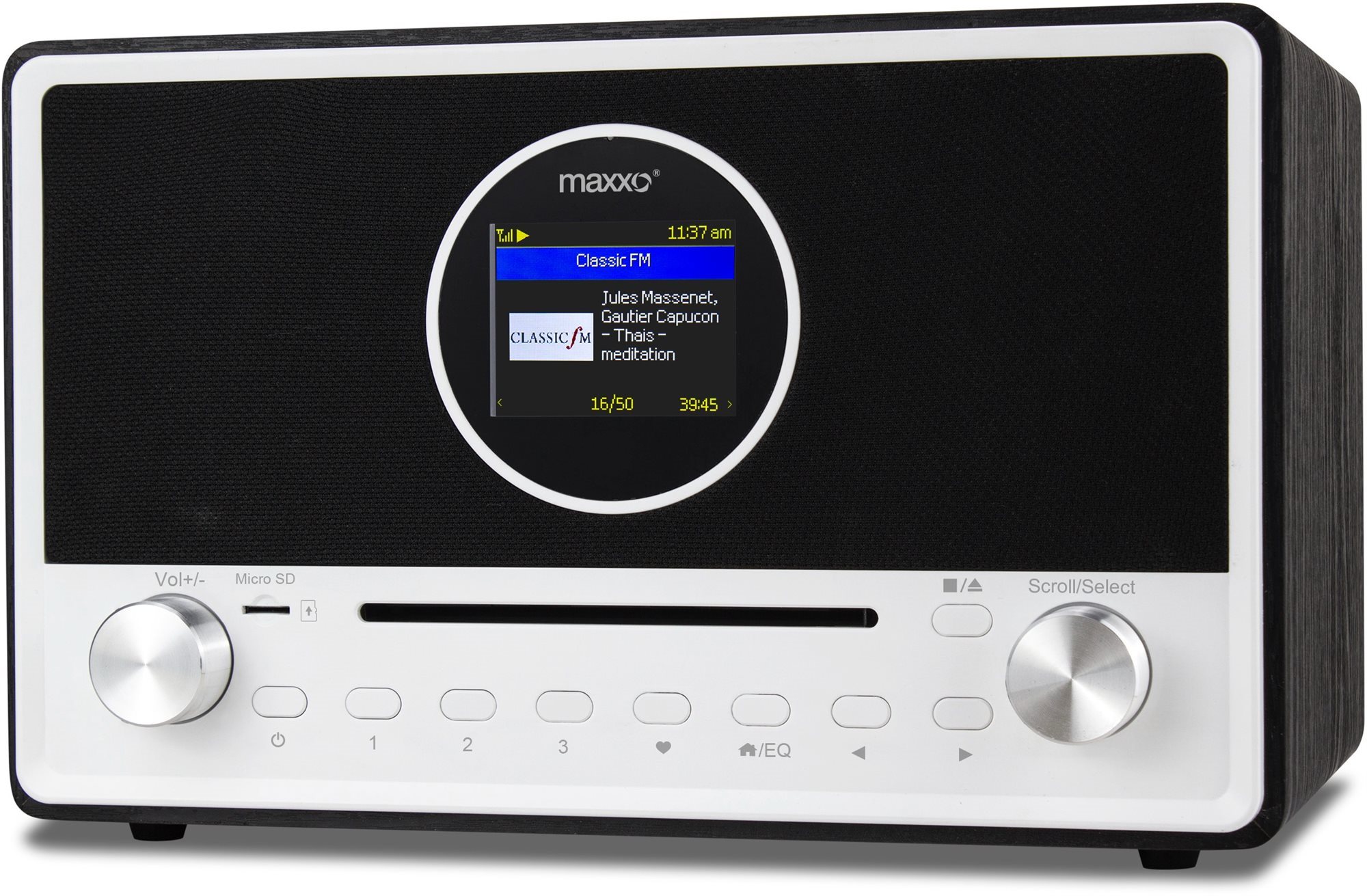 Rádio – internetové a klasické, DAB+, FM a RDS tuner disponuje 99 predvoľbami, podpora mp3, výkon 40 W, vstup USB a 3,5 mm Jack, výstup 3,5 mm Jack, automatické ladenie, Bluetooth, UPNP a WiFi, k podporovaným médiám patrí CD, microSD karta a USB flash disk, streamovacia služba Spotify, Deezer a Apple Music, budík a displej, diaľkové ovládanie súčasťou, napájanie sieťové, retro dizajn, biela a čierna farba Kľúčové vlastnosti rádia Maxxo DAB+ internetové rádio – CD03 Rádio Maxxo je vybavené tunerom na zachytenie DAB+, FM a RDS Zobrazí informácie o skladbe alebo aktuálnom obsahu Medzi obľúbené funkcie sa