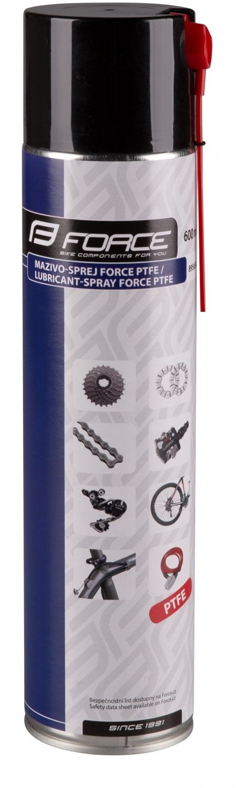 Cyklistické mazivo – sprej, do sucha aj mokrého, vhodné na kov, na reťaz, brzdy a rám, odolné proti vode a vetru, vodoodolné, špeciálne zložky PTFE, objem 600 ml Kľúčové vlastnosti cyklistického spreja FORCE PtFe, 600 mlUniverzálne mazadlo s vynikajúcou mechanickou a teplotnou stabilitou na ochranu kovových a mechanických častíSprej má veľmi nízky trecí faktor