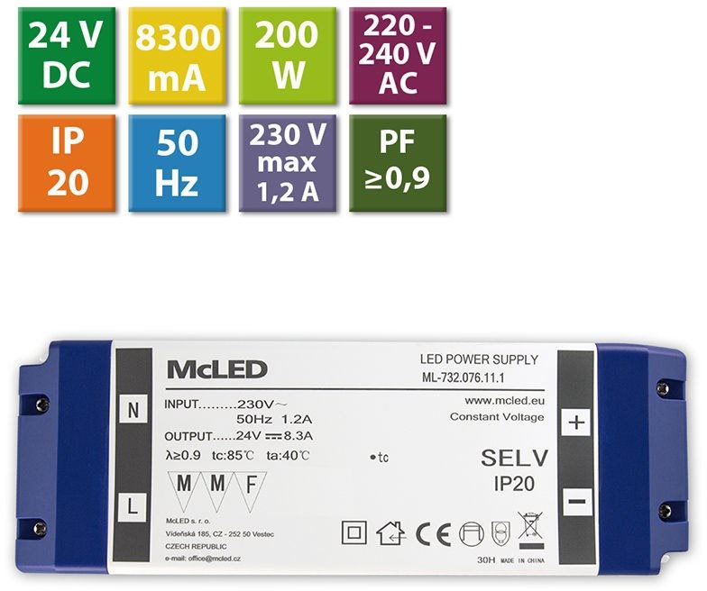 Napájací zdroj – jednosmerný výstup, napätie v rozmedzí 24 – 24 V, maximálny prúd 8300 mA, maximálny výkon 200 W, primárne určený na LED pásiky/panely Napájecí zdroj McLED slouží k napájení LED osvětlení, jako jsou pásky nebo panely. Nabízí celkový výstupní výkon 200 W a pracuje se stejnosměrným napětím 24 V. Maximální výstupní proud dosa