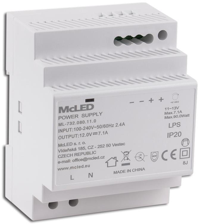 Napájací zdroj spínaný, jednosmerný výstup, napätie 12 V, maximálny prúd 7100 mA, maximálny výkon 90 W, primárne určený na LED pásiky/panely Spínaný napájecí zdroj McLED slouží k napájení LED pásků a panelů. Nabízí celkový výkon zdroje 90 W a výstupní napětí 12 V DC s maximálním proudem 7,1 A. Výstupní napětí lze regulovat v roz