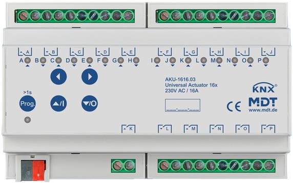Spínač – na svetlá, na DIN lištu, kompatibilný s OS Android a iOS, podpora aplikácií výrobcu, funguje cez centrálnu jednotku/bridge, maximálne napätie 230 V, maximálny celkový prúd 16 A 16-násobný univerzálny aktor MDT AKU 16 A možno použiť rôznymi spôsobmi: ako spínací aktor s rôznymi funkciami, ako žalúziový aktor s automatickou tieniacou funkciou alebo ako vykurovací aktor. Aktor