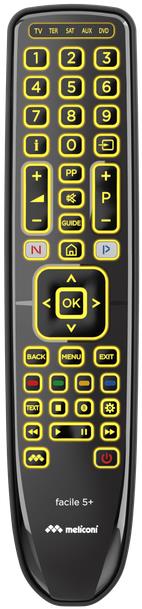 Diaľkový ovládač na TV – univerzálny, kompatibilný s DVD, Blu-ray, set-top boxom, až pre 5 zariadenia, infračervený prenos, klávesnica, kompatibilné aplikácie a ovládanie smart TV, na 2 AAA batérie Kľúčové vlastnosti diaľkového ovládača Meliconi 806080…