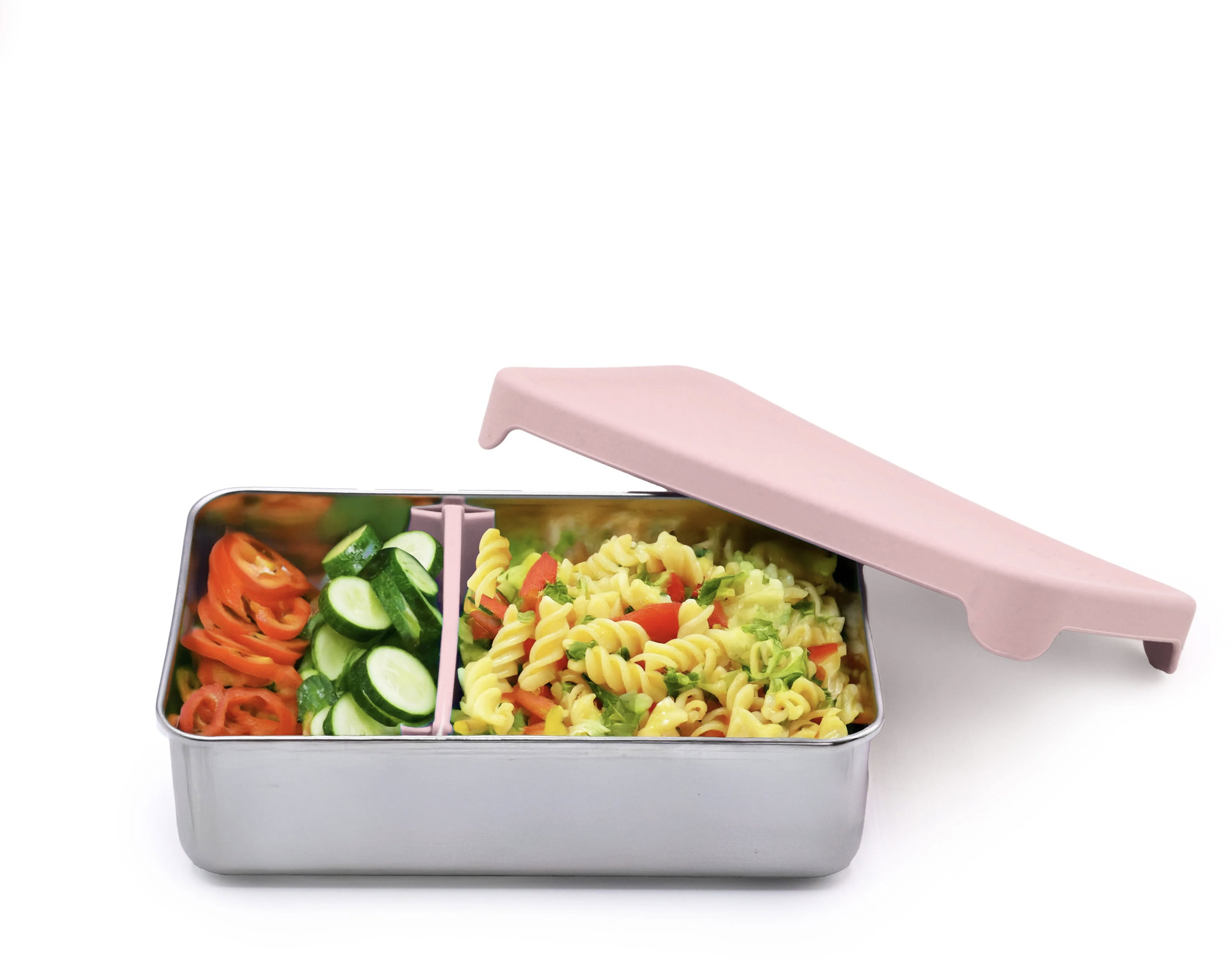 Desiatový box – delený, detský, objem 0,74 l, rozmery 18,3 × 11,3 × 5,8 cm (V׊×H), nasadzovacie veko, vhodný do umývačky, materiál nehrdzavejúca oceľ a silikón, ružová farba Detský box na desiatu Melii s nasadzovacím…