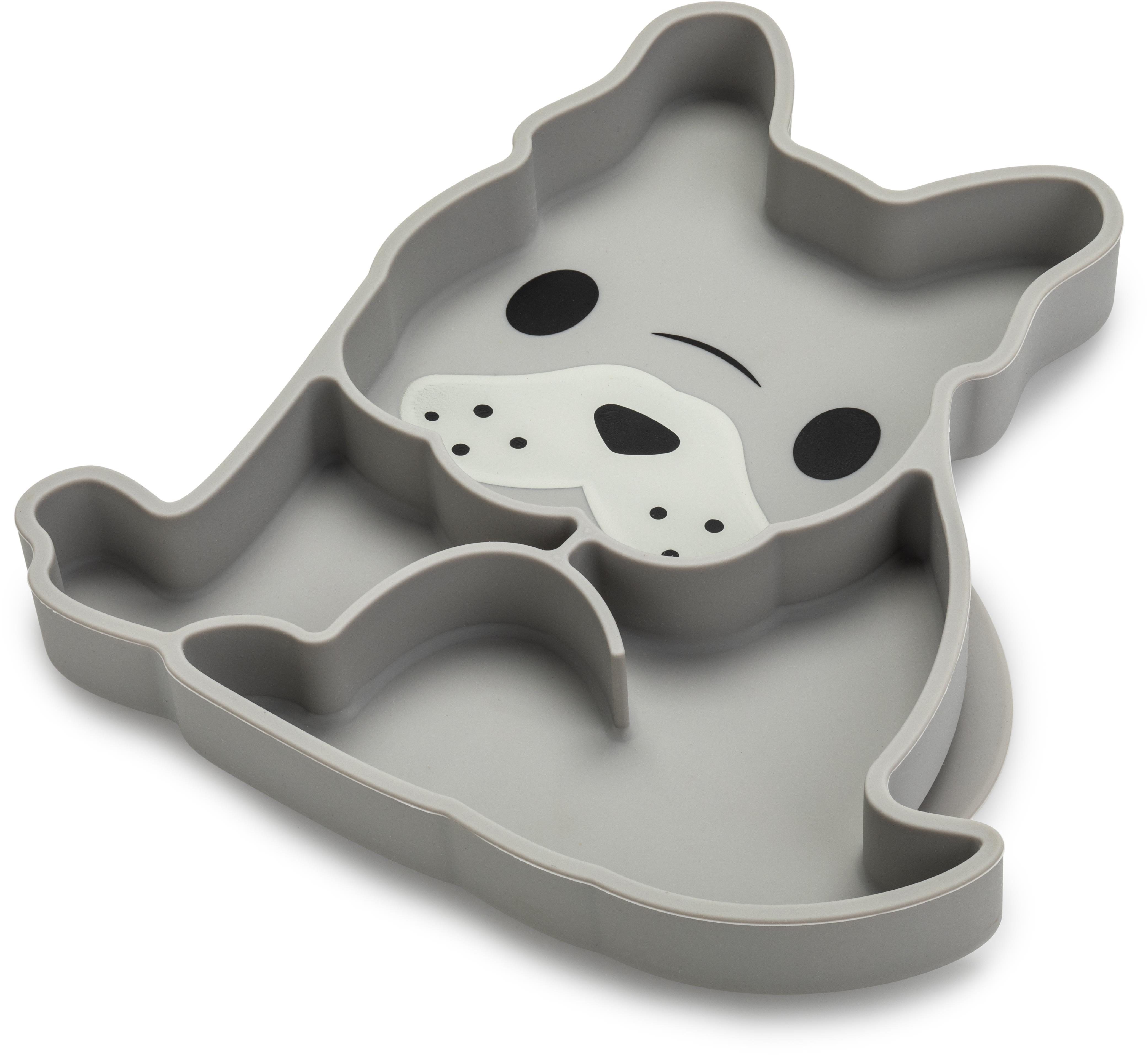 Detský tanier – silikónový, s prísavkou, vhodný do mikrovlnnej rúry, odolný proti nárazu, vhodný do mrazničky, vhodný do umývačky riadu, predelená vnútorná časť, motív zvieratká, určený od 6 mesiacov, sivá farba, rozmery 16,5 × 20,5…